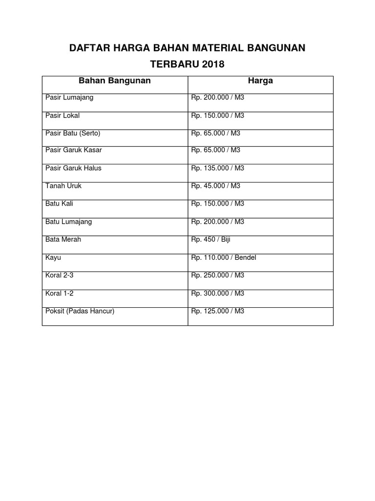 Bahan bangunan memang menjadi salah satu hal yang paling penting dalam proses pembuatan sebuah rumah, gedung, perkantoran, jalan dan sejenisnya. Daftar harga kayu terbaru 2021. Daftar harga kaca terbaru mei 2021 67.63 views per day; Apartments with single and double rooms are suitable for students and small families. Promo 37+ harga bahan bangunan. Daftar harga bahan bangunan berkualitas terlengkap dan terbaru untuk seluruh indonesia. Daftar harga bahan bangunan terbaru juni 2021. Daftar harga satuan bahan bangunan no uraian satuan harga keterangan 1 air m3 35,000 belum termasuk 2 aluminum foil m2 70,000 pajak dan 3 aspal curah kg 7,500 retribusi bahan aspal drum ac 60/70 kg 8,000 galian c 4 asbes semen gel. Harga es krim walls murah dan enak; 4, daftar harga satuan upah. Bagi yang mau membangun rumah, atau toko, bisa menghitung berapa dana yang dibutuhkan. Cara bermain binomo biar menang terus di hp; Daftar harga menu kfc murah terbaru;